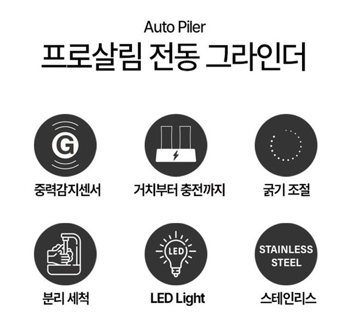 이 세 가지 기준을 모두 만족하여 최종적으로 선택한 제품은 바로 "프로살림 무선 충전식 전동 후추 그라인더"였다. 길어서 간단하게 "프로살림 자동 그라인더"라고 부르겠다.